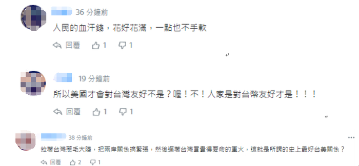 还有网友说,“人民的血汗钱,花好花满,一点也不手软。”“所以美国才会对台湾友好不是?喔!不!人家是对台币友好才是!!!”“拉着台湾惹毛大陆,把两岸关系搞紧张,然后逼着台湾买贵得要命的军火,这就是所谓的史上最好台美关系?”