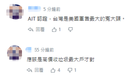 还有网友称,“买了一堆很贵的破铜烂铁。”“台湾成了美国最大的旧货存放仓库。”