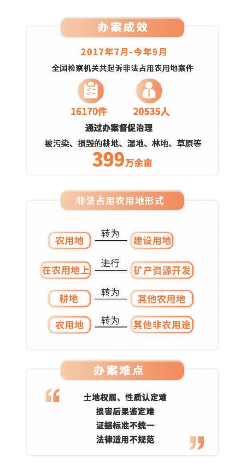 近年来,全国检察机关充分发挥检察职能,依法严厉打击非法占用农用地犯罪行为。2017年7月至今年9月,共起诉非法占用农用地案件16170件20535人,通过办案督促治理被污染、损毁的耕地、湿地、林地、草原等399万余亩。