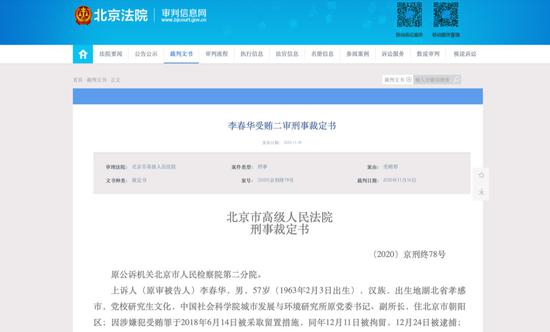北京高院刑事裁定书显示,李春华57岁,中国社会科学院城市发展与环境研究所(以下简称社科院城环所)原党委书记、副所长,因涉嫌犯受贿罪于2018年6月14日被采取留置措施,同年12月11日被拘留,12月24日被逮捕。