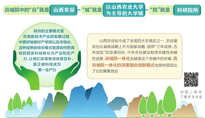 早在去年10月,山西农业大学就与山西省农科院进行了合署办公,意味着双方深度融合,共同助力山西农谷发展。今年这项“拆墙透绿”之举,也意味着农大与农科院合署改革的进一步深化,实现谷、城、院三方的一体化发展。谷城院中的“谷”就是山西农谷,“城”就是以山西农业大学为主导的大学城,“院”就是科研院所。目前,山西农业大学创新创业学院已落地晋中国家农高区科创城,农大继续教育学院也将落地农谷。未来,山西农大还会有更多专业学院走进农谷,实现产学研用贯通融合。