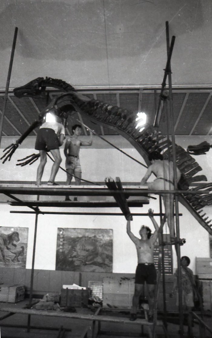 1978年以来,黑龙江省博物馆对嘉荫龙骨山进行了多次抢救性大规模野外发掘。上世纪八十年代初,在我校黑龙江校友的协调下,博物馆时任馆长王良忱、副馆长黄伯裔等人多次前往哈尔滨商议恐龙骨架移交事宜。他们坚持不懈的精神感动了黑龙江省博物馆,最终将其中这具满洲龙骨架有偿交换给了我校,成为师生从事古生物教学科研的重要标本。