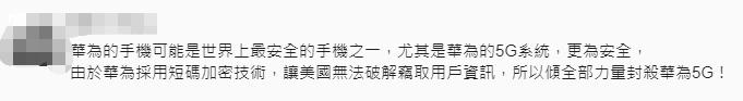 “华为的手机可能是世界上最安全的手机之一,尤其是华为的5G系统,更为安全,由于华为采用短码加密技术,让美国无法破解窃取用户资讯,所以倾全部力量封杀华为5G!”