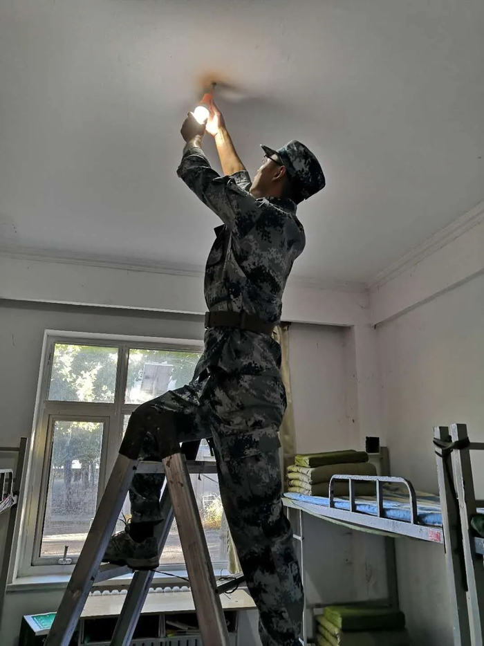 学生军训期间张伟鑫更换训练基地灯泡