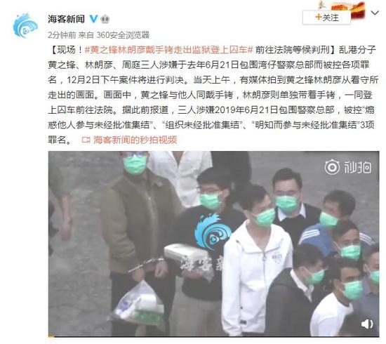原标题:现场!黄之锋林朗彦戴手铐走出监狱登上囚车 前往法院等候判刑