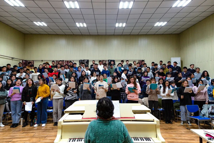 合唱团每年冬天都会有一次音乐会,给大家带来最温暖的声音。开学招新结束后,合唱团就开始了漫长的准备和排练。精选出的十多首歌、厚厚的一本谱集、密密麻麻的数字音符……有很多新生没有接触过合唱,声部长、声乐指导和留下来的老生自然担负起教歌、带歌的重任。一个人学会一首歌不难,但很多人唱齐一首歌是一件有些复杂的事。每个人有不同的音色和音调,但最后要发出同一种声音,要用几个声部的和声,唱出不同的和弦变奏。一句一句反复练习,每一个音的纠正,用手打出数不清的拍子。终于,合排时在汪老师的大声指导下,老生和新生共同唱出了第一个和弦。