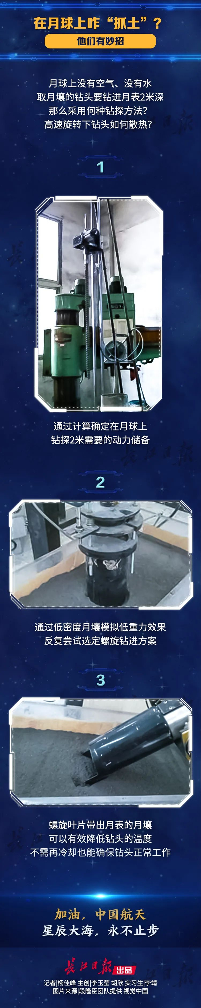 “钻头钻进后,月壤的一部分会由钻头的螺旋叶片带出月表,另一部分月壤通过空芯钻杆带回地球。”段隆臣团队成员高辉副教授介绍,嫦娥的取土作业采用表取和钻取两种方式进行。