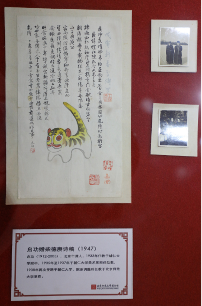 北师大的学术传统有三个来源:民国时期的北平师大(和北大同源的京师大学堂的师范馆)、1926年成立的辅仁大学、1908年成立的京师女子师范学堂(1924年改称女师大,1931年并入北师大),三所学校在学术上有不同的风格和特点,这三个来源汇聚为北师大深厚的学术传统。这次展品中有一件1948年辅仁大学校友节返校校友的题名,柴德赓写了一个识语,从中可看出当时校友节的文化活动非常丰富,有明清学者书法作品展,有沈兼士先生遗物展(沈兼士头一年去世的),还有在校师生的书法展。这种熏陶是很有意义的。