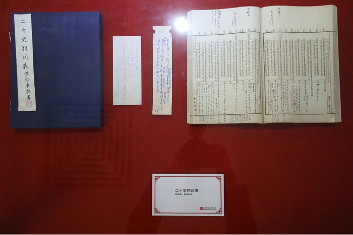 还有《二十史朔闰表》。《二十史朔闰表》是陈垣先生编定的工具书。研究古代中西方交流需要对照华夏历与西历、回历,但学术界从无中西回历比照年表,陈垣先生就花若干年功夫做了这个工具书。这次展出的是自己使用的一部,首尾都翻烂了,这是修复后的样子。书上每一页都有批注,对应的是他自己的学术思考和学术成果。书里还有大量浮签,即随时记录下来的思考,从中能看到老一辈学者的治学态度和治学方法。
