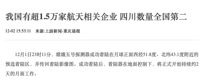据上游新闻报道,12月2日,天眼查专业版数据显示,我国目前有超过1.5万家经营范围含“航天”,且企业状态为在业、存续、迁入、迁出的航天相关企业。