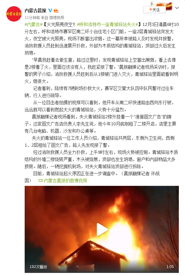 12月3日清晨6时10分左右,呼和浩特市赛罕区南二环小台住宅小区门前,一座2层青城驿站突发大火,夜空被火光照亮,现场不断冒出浓烟。这一幕所幸被路人及时发现并报警,消防救援人员赶到迅速展开扑救,外部为木质结构的青城驿站,顶部过火后发生坍塌。