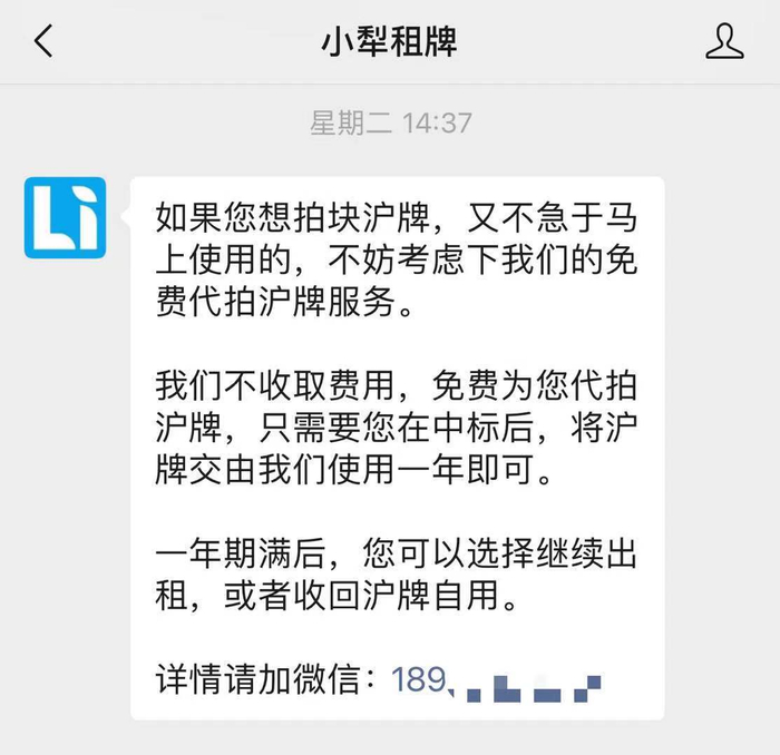而在“小犁租牌”则是上海某汽车贸易公司用于业务推广的公众号。让人意外的是,这家公司还推出了“免费代拍沪牌”服务,竟有这等好事?咨询得知,由该公司免费代拍获得的沪牌额度,需要交由该公司使用一年。“一年期满后,可以选择继续出租,或者收回沪牌自用。”