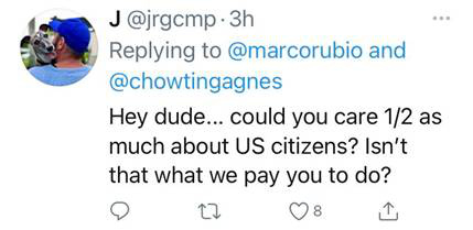 “唐纳德·特朗普正在破坏美国民主,他的失败抗疫政策正导致每天数千人死亡,然而马尔科(卢比奥)却在关注香港。”