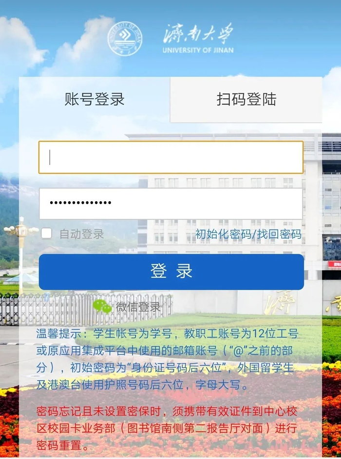 账号和密码为统一身份认证账号密码。教师账号为12位工号,学生账号为学号(如果未曾修改过智慧济大密码,则默认为身份证后六位)