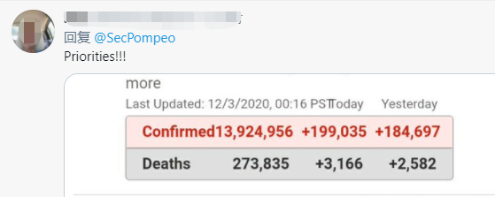 在他的发文下方,不少网友留言表示不满。有美国网友贴出美国新冠肺炎确诊数的图片,并表示“这才是美国应该管的优先事项!”