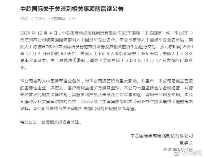 中芯国际发表声明称,该公司被列入中国涉军企业名单,对其运营没有重大影响。并重申,该公司是独立营运的国际性企业,投资人、客户等利益相关方遍及全球。该公司一直坚持合法合规经营,并遵守经营地的相关法律法规,其服务和产品从未涉及任何军事用途,皆用于民用及商用。该公司强烈反对美国国防部的决定,此举反映了美国国防部对本公司业务与技术最终用途的根本误解。该公司会继续与美国政府相关部门保持积极的交流沟通。