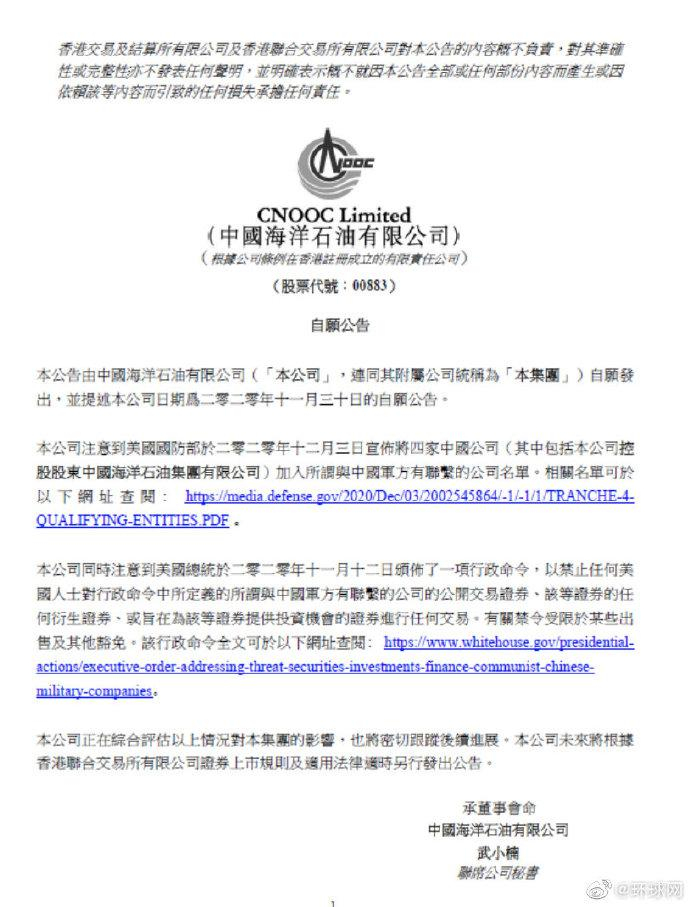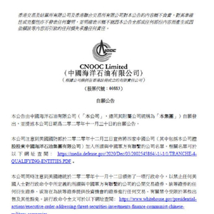 中海油在声明中称,该公司正在综合评估以上情况对本集团的影响,也将密切跟踪后续进展。该公司未来将根据香港联合交易所有限公司证券上市规则及适用法律适时另行发出公告。