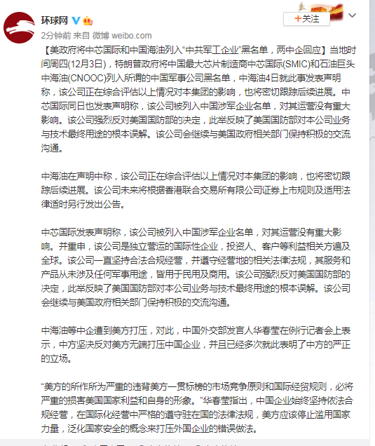当地时间周四(12月3日),特朗普政府将中国最大芯片制造商中芯国际(SMIC)和石油巨头中海油(CNOOC)列入所谓的中国军事公司黑名单,中海油4日就此事发表声明称,该公司正在综合评估以上情况对本集团的影响,也将密切跟踪后续进展。中芯国际同日也发表声明称,该公司被列入中国涉军企业名单,对其运营没有重大影响。该公司强烈反对美国国防部的决定,此举反映了美国国防部对本公司业务与技术最终用途的根本误解。该公司会继续与美国政府相关部门保持积极的交流沟通。