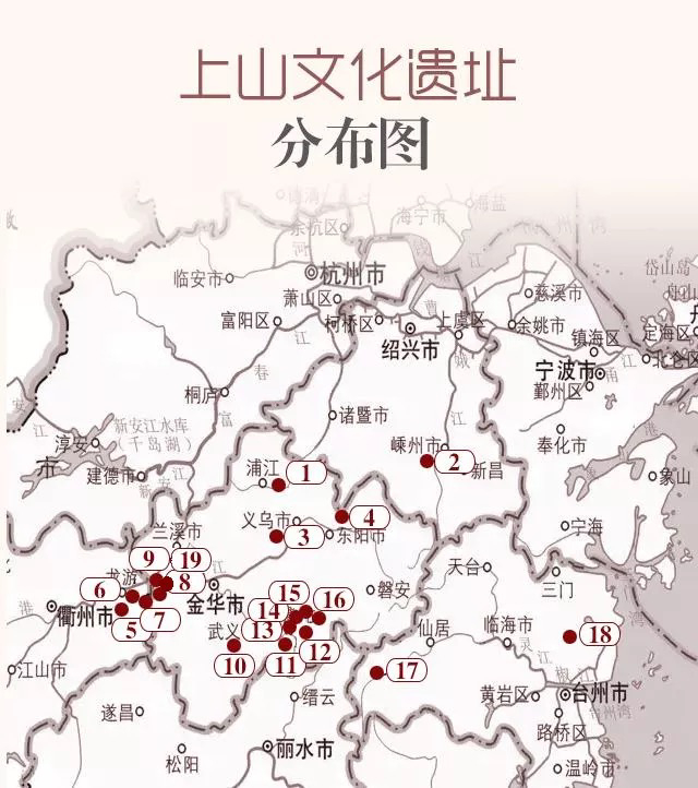 20年间,上山文化的遗址在钱塘江上游流域及相邻的灵江流域已经发现了19处。
