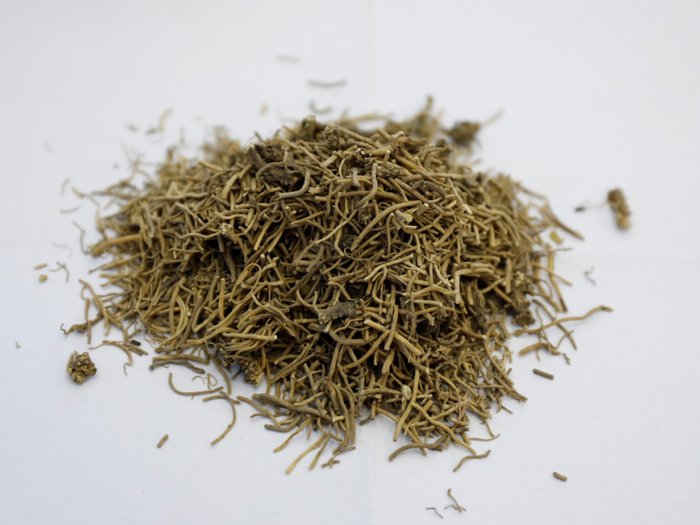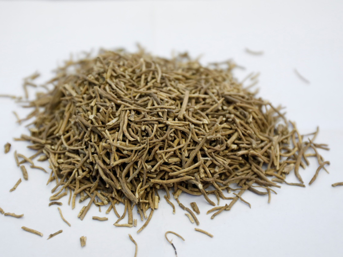 C 白薇饮片 本品根茎粗短,有结节,多弯曲。上面有圆形的茎痕,下面及两侧鲽生多数细长的根。表面棕黄色。质脆,易折断,断面皮部为黄白色,木部为黄色。气微,味微苦。
