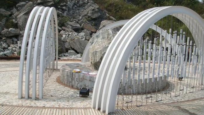 以矿山特有的岩芯为素材和构筑材料,独具匠心地构思,创意构建成主题雕塑,如岩芯墙、岩芯博览园、芯韵广场、竖琴、编磬、行走的石头、钻机广场等景观广场和小品。将音乐元素形象化演绎在景观作品之中,铜质加工的《地质勘探队员队之歌》五线谱被制作成浮雕,镶嵌在岩芯墙上, 跳跃的音符成了矿山公园活泼的景观元素,既有游憩欣赏效果又有游览的导向作用。利用岩芯、废弃钢管、钢丝等材料,制作出具有大冶矿山特色的竖琴、编磐,有机穿插在矿山公园之中。岩芯博览园汇集了大量的岩芯标本,结合水景与灯光打造一个户外的岩芯博物园。此外,体量巨大的选矿车间,随着矿山铁矿石的采选量日益减少,显得冷清与孤傲,尝试通过产业转型的方式,让过去的铁矿采选产业转变为现在以旅游和文创为主的矿山公园,故将原来的选矿车间规划为矿业博物馆。车间里硕大的生产装备原样放置在那里,与矿业相关的运输工具、采掘工具等充实到馆内,让选矿车间在新的历史条件下仍焕发出的光彩。