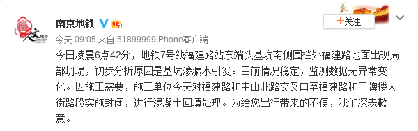 今日凌晨6点42分,地铁7号线福建路站东端头基坑南侧围档外福建路地面出现局部坍塌,初步分析原因是基坑渗漏水引发。目前情况稳定,监测数据无异常变化。因施工需要,施工单位今天对福建路和中山北路交叉口至福建路和三牌楼大街路段实施封闭,进行混凝土回填处理。为给您出行带来的不便,我们深表歉意。