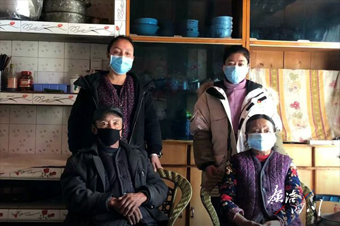 张付玉(左一)在帮扶贫困户倪罗卜大叔家(韩兴鸿摄)