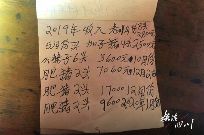 “这个是我自己记的卖猪的账,买饲料和粮食支出的钱我没写,但我都记着,我给你念,你给我算一下总账嘛。”到了倪大叔家,俄麦用不太流利的汉语一边说,一边翻着自己的小册子。册子上歪歪斜斜地写着“2019年收入表”。虽然字迹不漂亮,但每次卖猪的时间、数量、价格等信息却标注得清清楚楚。