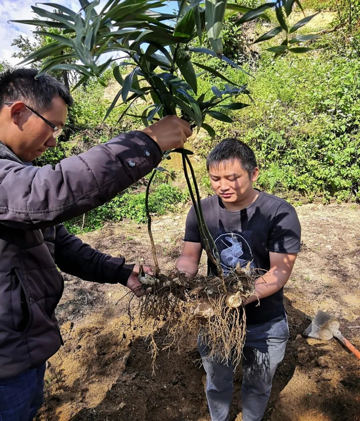 ▲2019年10月2日,红塘村滇黄精种植专业合作社社长李茂昌(左)正在取鲜黄精