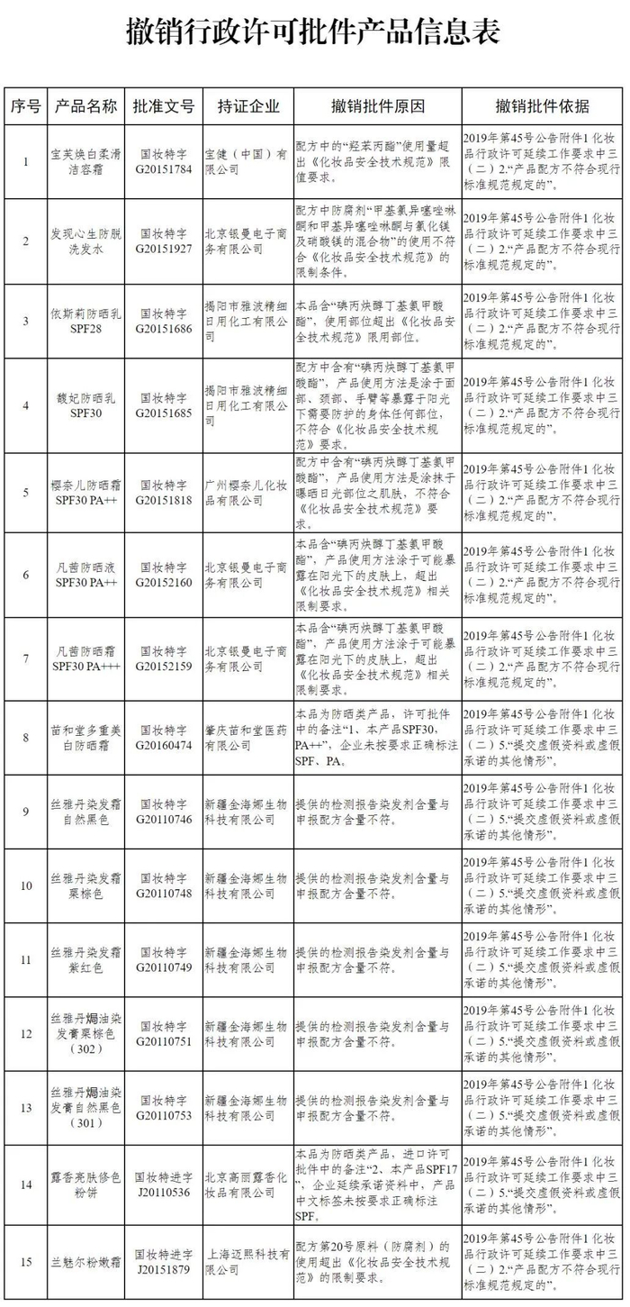 公告称,依据《关于实施特殊用途化妆品行政许可延续承诺制审批有关事宜的公告》(2019年第45号)要求,国家药品监管局组织开展特殊用途化妆品行政许可批件延续申报资料技术审查,发现产品名称为“宝芙焕白柔滑洁容霜”(批准文号:国妆特字G20151784)等15个特殊用途化妆品,存在不符合产品安全性相关规定要求等违法违规情形,现依法予以撤销批准文号。
