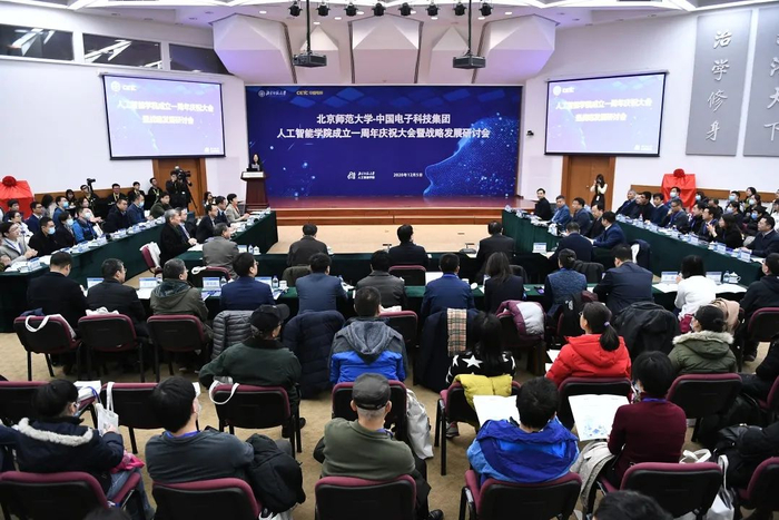 12月5日,人工智能学院成立一周年庆祝大会暨战略发展研讨会在北师大英东学术会堂举办。浪潮集团首席科学家王恩东院士、军委科技委专职委员廖湘科院士、国家自然科学基金委信息学部常务副主任张兆田、国防科技大学教授胡德文、中科院自动化所教授刘成林、北京大学教授黄铁军、哈尔滨工业大学教授刘挺等特邀嘉宾,北京师范大学党委书记程建平,中国电子科技集团副总经理黄兴东、科技部部长张龙等共建双方领导出席大会。北师大人工智能学院全体教师和学生代表,学校人才人事处、发展规划处、科研院、教务部(研究生院)相关负责同志,以及来自中国电科电子科学研究院、信息科学研究院、第三研究所、第十五研究所、第二十八研究所、第三十研究所、海康威视和司法研究院的领导与专家参加会议。