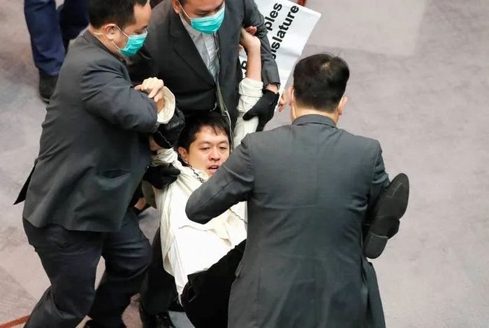 今年5月28日,许智峰又在立法会手持腐烂植物,被保安阻止时强行将其扔在主席台前,发出浓烈恶臭,令会议不得不暂停。2个月后,他故技重施,在立法会审议《国歌条例草案》期间,手持不明液体突然冲向主席台,将刺鼻恶臭的液体倾倒地上,导致审议暂停。