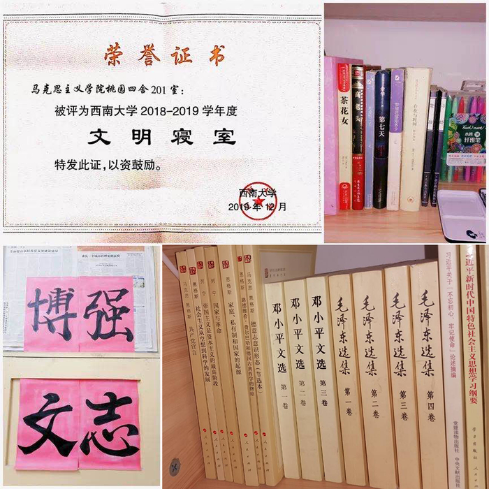 保研成功后,四个人并没有想象中的轻松,她们依旧各自按着规划努力着:王婷参加了教师资格证考试;王钰洁在认真做好学习工作的同时,成为了年级长,主动为考研同学提供帮助,还加入了媒体中心,培养多方面技能;李娅萌在规划着以后读博,以高涨的热情投入到学术毕业设计中;伍欣则在设计毕业论文之外,担任了学委和学生处助理,还参加了重庆市精准扶贫工作成效第三方评估调研。这个团结温暖的集体,也被评选为“求真学问型”重庆市特色寝室。