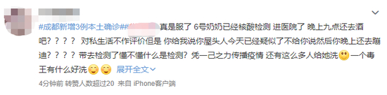 有网友认为爷爷奶奶6日白天已经被确诊为新冠病例,赵某此前探望陪餐就应该有防范意识。但仍不戴口罩,在短短几日出现在多个公共场所,给疫情防控工作增加了难度。甚至还有不理性的声音,对女孩的私生活进行了批判。还有人对女孩的长相进行了攻击批判。甚至称她为转场皇后。