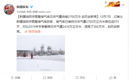 12月7日,记者从新疆油田呼图壁储气库获悉,储气库已维持日采气量2700万立方米高位运行3天,对比2019年冬季最高日采气量2434万立方米,提高了266万方,创历史新高。