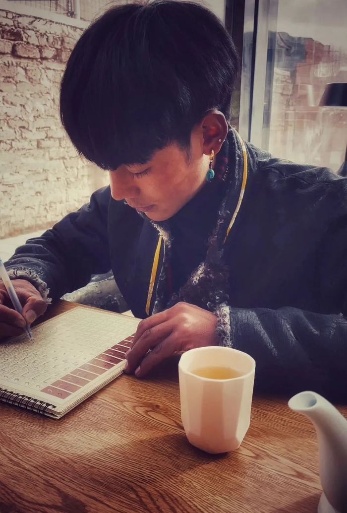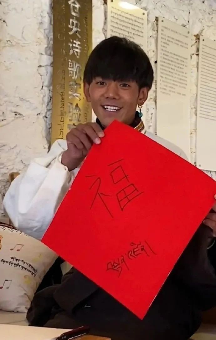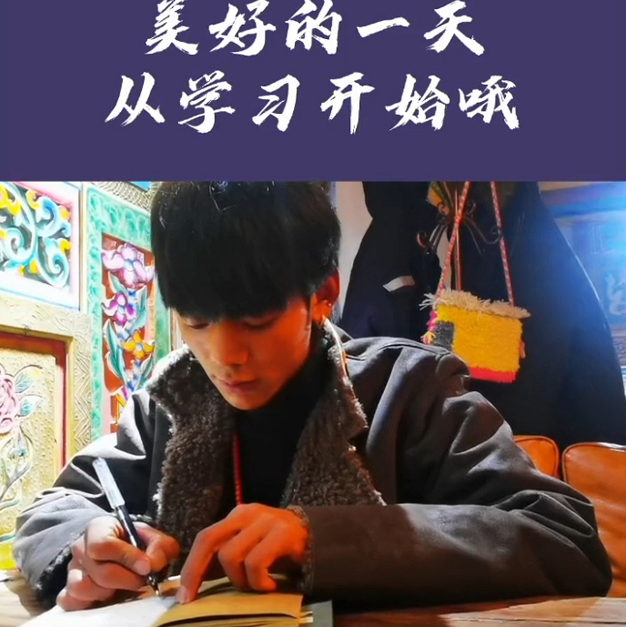 丁真藏文写得好看,也读过不少仓央嘉措的诗,他说这些诗都记在心里,并用藏语向记者背诵起来:在那东山顶上,升起白白的月亮,年轻姑娘的面容,浮现在我的心上。
