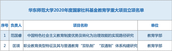在稍早公布的2020年度国家社科基金单列学科教育学重大项目立项名单中,共有6个项目获批。其中,华东师大中标2项,居全国第一,首席专家均来自教育学部。