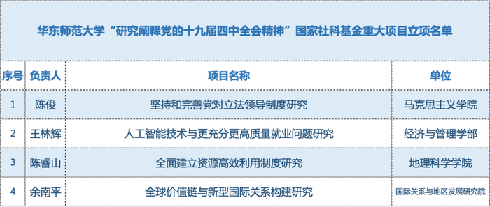 此外,国家哲社办在今年四月份公布了“研究阐释党的十九届四中全会精神”国家社科基金重大项目,共有109个项目获批。华东师大中标4项,居全国并列第四,上海并列第一,首席专家分别来自马克思主义学院、经济与管理学部、地理科学学院和国际关系与地区发展研究院。