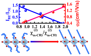 面内载流子迁移率(jm)、宽带荧光发射(IBE/INE)对有机阳离子构象有序度的依赖关系。