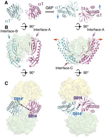 陶余勇/李旭团队通过分别解析无底物状态和G6P结合状态的HptA结构,发现G6P可以结合于两个HptA蛋白间的缝隙中,并能引起两个HptA蛋白相互靠拢。HptA蛋白与HptS蛋白细胞周质结构域(HptSp)的复合物结构显示,HptA可以通过组成型界面以及另一个可切换界面与HptS进行不同形式的相互作用:不结合G6P的时候,HptA和HptSp远离膜的一侧结合,并导致两个HptSp以相互平行的方式排列;当HptA结合了G6P以后,HptA与HptSp的结合位点切换至靠近膜的一侧,引发HptSp旋转,并使两个HptSp的C末端相互靠近,进而引发胞外信号向胞内转导。在上述结构发现的基础上,陶余勇/李旭团队结合对HptA和HptS突变体的生化和生长分析,提出了界面开关介导的G6P-HptRSA信号转导机制。上述研究结果为细菌的营养感应机制提供了重要线索,扩展了学界对TCS传递外部信号的激活模式的理解。
