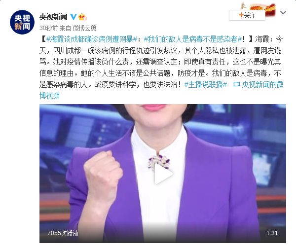 海霞谈成都确诊病例遭网暴:我们的敌人是病毒不是感染者!