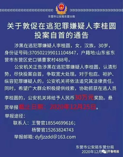 12月7日,东营警方发布一则通告,敦促李桂圆投案自首,提供线索的最高奖励30万。警方介绍,此女心智成熟,心思缜密。