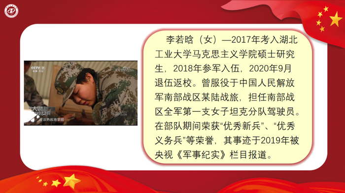 “从我报名参军的那天起、甚至是到了部队,经常会有人问我:李若晗,你都已经读研了、怎么还想着去当兵?”面对这些疑问,李若晗的回答是:“当兵是我从小的梦想,能够实现梦想我感到非常幸运!”