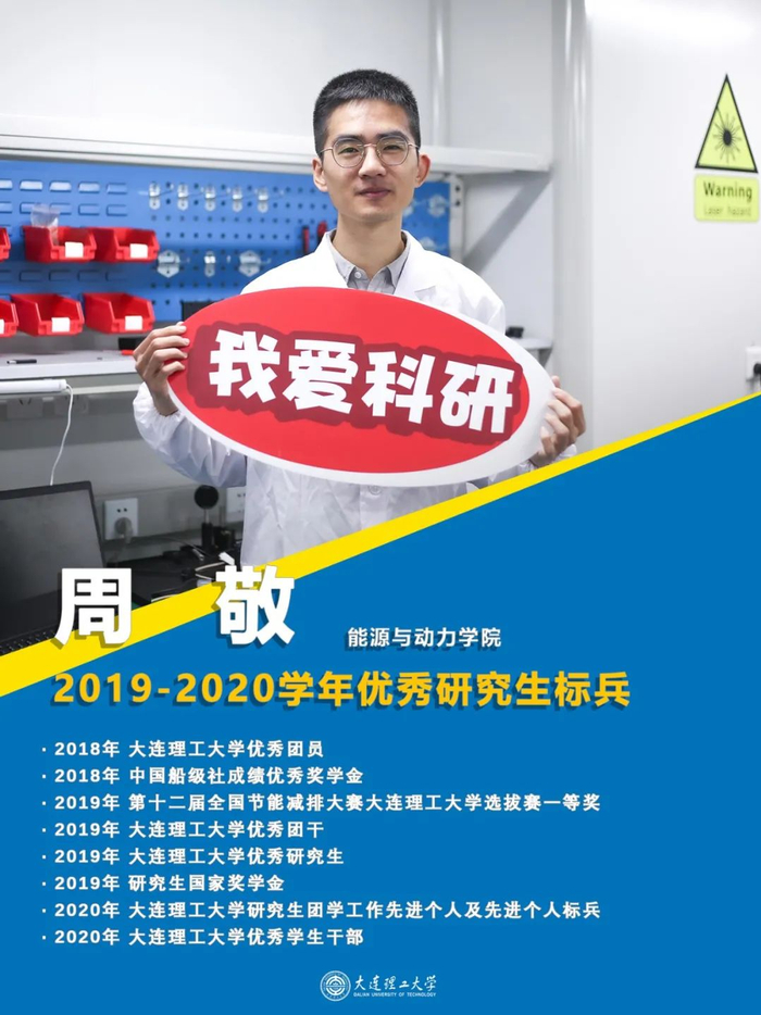 周敬,共青团员,能源与动力学院2018级硕士研究生,研一时提交硕博连读申请,现已转入博士阶段,并担任大连理工大学博士生兼职辅导员。努力学习与科研,必修课程加权平均分达到90.13分;发表一作EI期刊文章1篇,1篇一作SCI论文小修后录用;积极参加中英文学术会议,发表一作会议论文4篇,并且作国际学术会议英文口头报告1次。凭借优异的学习成绩与突出的科研成果,获得国家奖学金、中国船级社成绩优秀奖学金、大连理工大学优秀研究生、大连理工大学优秀团员等奖励和荣誉。对社会工作认真负责,研一担任学院研会体育部部长,研二担任学院研究生团工委常务副书记,认真落实校团委布置的各项任务;积极参加学校举办的各类文体科创竞赛活动,多次取得运动会前三名的出色成绩。
