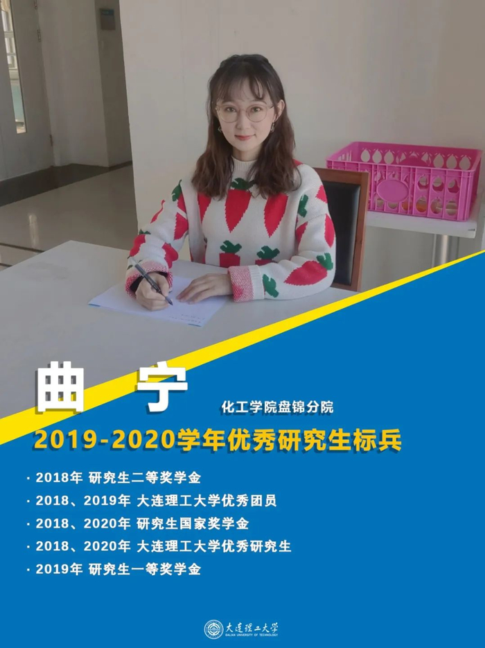 曲宁,中共党员,化工学院盘锦分院化学专业2018级硕士研究生。研究生期间,先后在 Materials ResearchExpress、Applied Surface Science、 Nanoscale等刊物发表SCI论文6篇;申请并公开国家发明专利12项,其中2项已获得授权。积极参加社会工作,曾任研究生会文化部副部长一职,并于2019年成功举办“启程之夜,拾光有你”校区元旦晚会,为历届最佳;入学以来两次获得研究生国家奖学金,两次获得大连理工大学优秀研究生。兼顾科研学习和生活,曾参加研究生会羽毛球比赛,并获得女子单打季军,曾代表化工学院盘锦分院参加2019级毕业生篮球比赛。