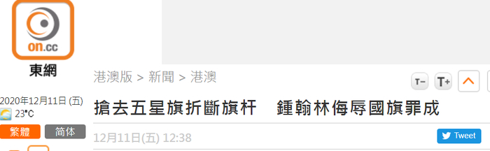 原标题:抢五星红旗并折断旗杆扔地上,乱港分子钟翰林侮辱国旗罪成