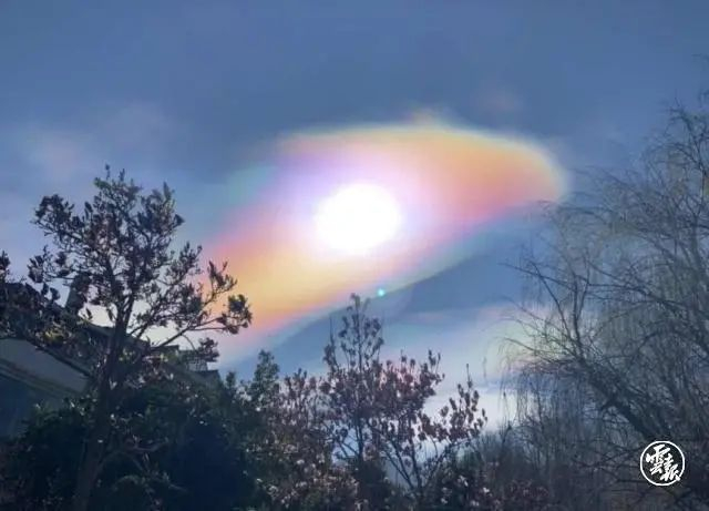 “七彩云”是指太阳光线与云彩中的冰晶结构产生的自然现象,是典型的“日华”现象。在合适的天气状况下,太阳光正好和云构成一个合适的角度,太阳光通过云彩时,通过折射和反射作用,上空云彩内的水汽将太阳光谱分离,从而散射出七色光芒。