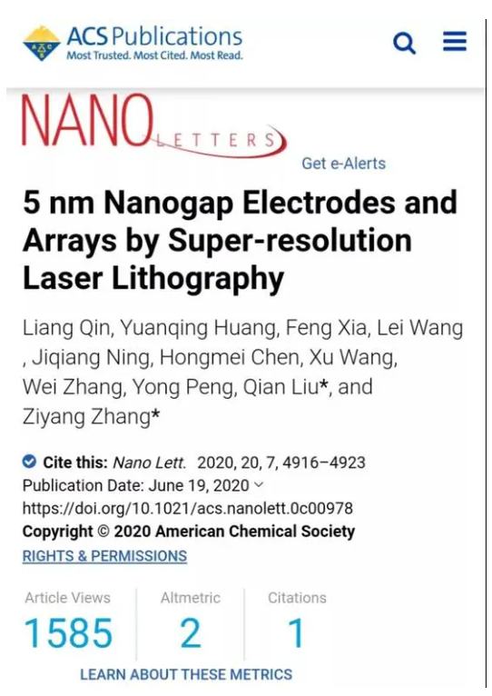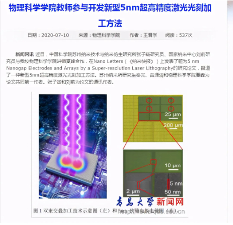 青岛大学新闻网于2020年7月10日报道称,近日,中国科学院苏州纳米技术与纳米仿生研究所张子旸研究员、国家纳米中心刘前研究员与青岛大学物理科学学院讲师夏峰合作,在Nano Letters(《纳米快报》)上发表了题为5 nm Nanogap Electrodes and Arrays by a Super-resolution Laser Lithography的研究论文,报道了一种新型5nm超高精度激光光刻加工方法。苏州纳米所研究生秦亮、黄源清和物理科学学院夏峰为论文共同第一作者。张子旸和刘前为论文的通讯作者。