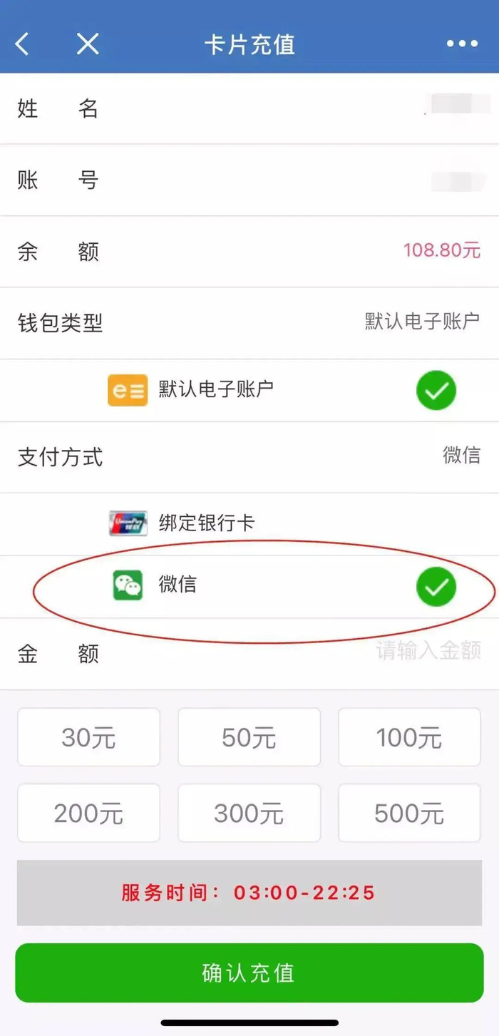 温馨提示:首次使用,请先到自助圈存机或自助补卡机上修改转账标志为自助;“绑定银行卡”充值,只能是财务处登记核实的中国银行卡号;“微信”充值,可使用“零钱”支付,也可绑定任意银行卡支付;充值金额为定额充值。