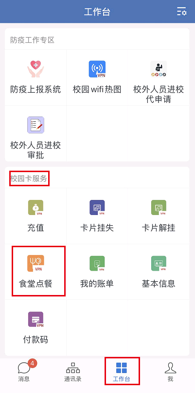 2. 点餐:选择“工作台”—"校园卡服务”—"食堂点餐”
